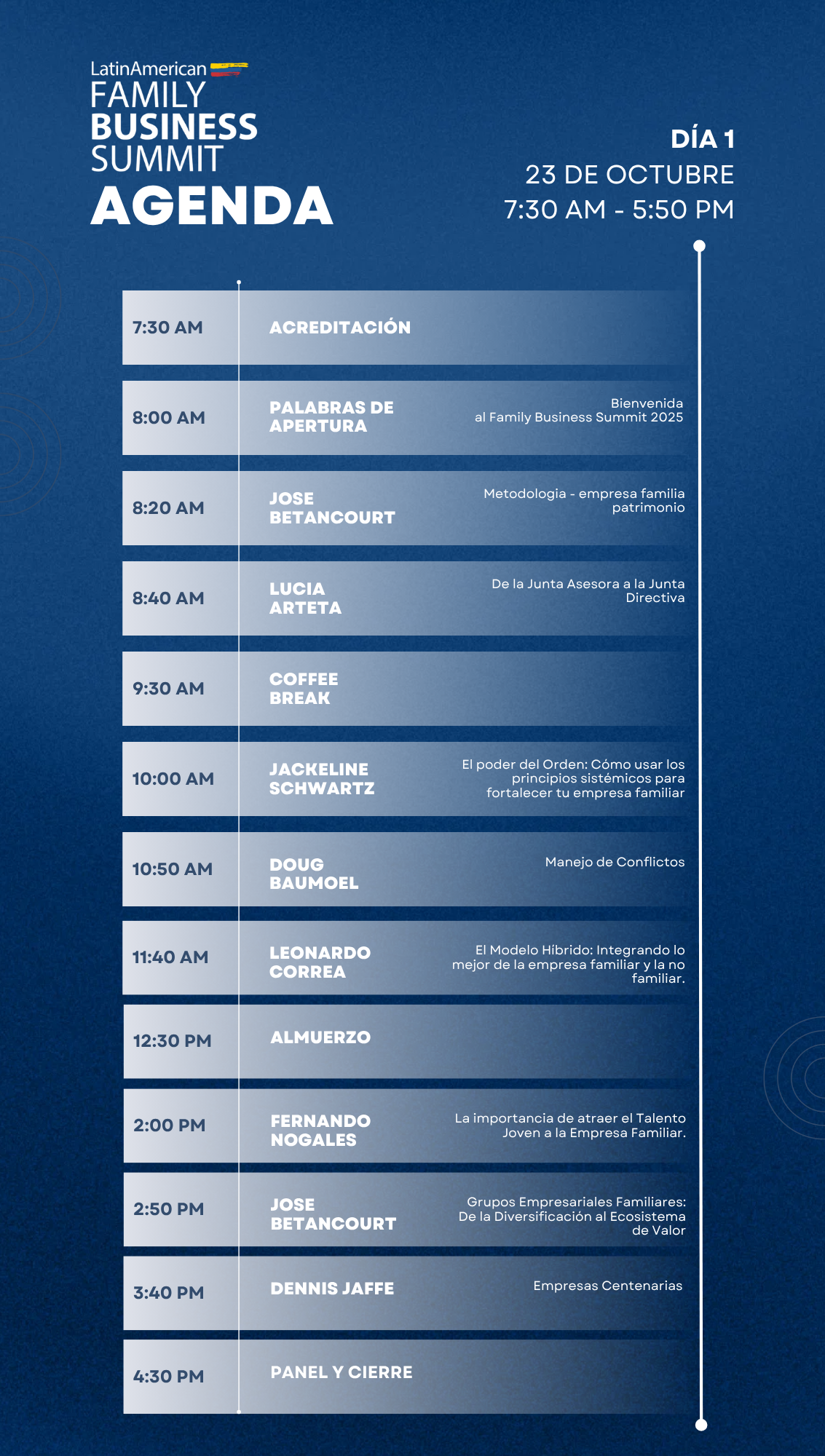 En el Family Business Summit, el rol de José Betancourt como moderador académico será clave para garantizar la fluidez, coherencia y profundidad del evento. Su experiencia en empresas familiares lo convierte en el guía ideal para conducir cada bloque temático con sentido estratégico y visión integradora.