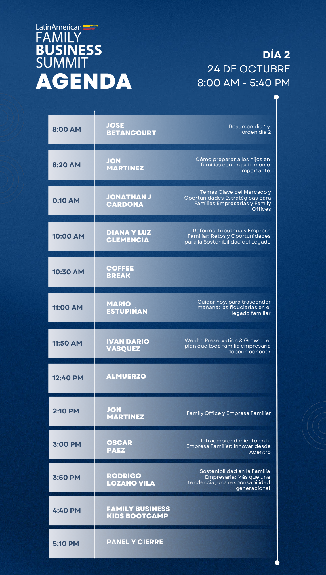 Durante dos días, exploraremos los desafíos y oportunidades que enfrentan las familias empresarias en su camino hacia la perdurabilidad, abordando temas cruciales relacionados con el gobierno familiar, la profesionalización, la sucesión, la innovación y la gestión del patrimonio, siempre desde una mirada que conecta el legado con el futuro.